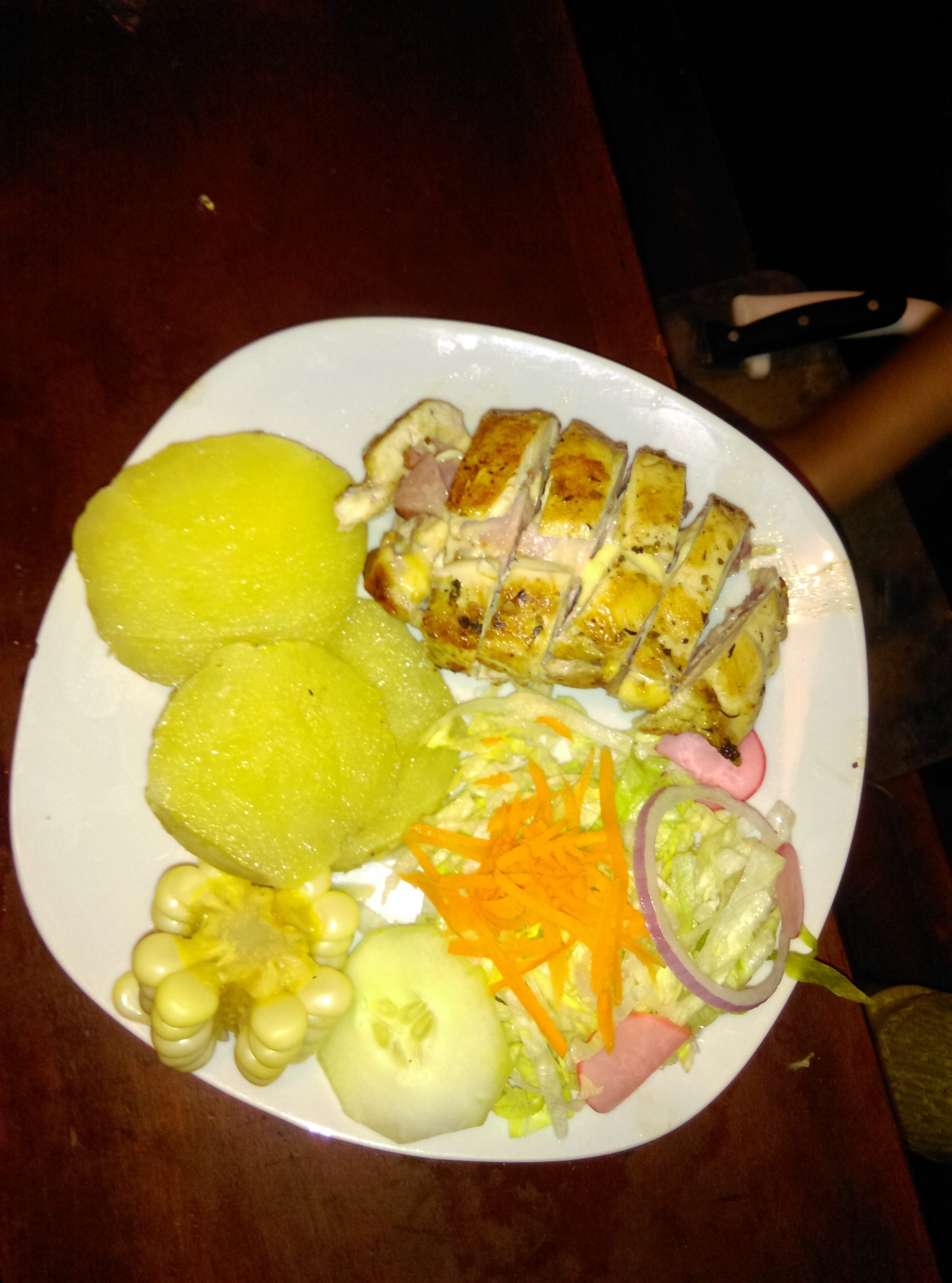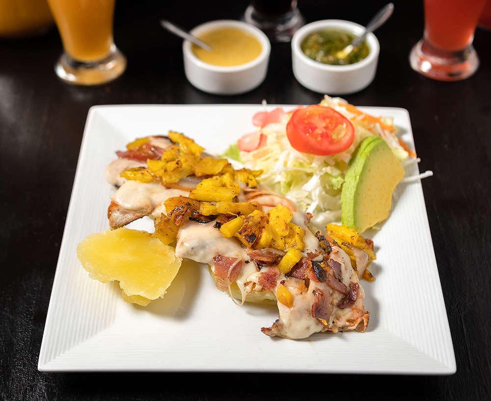 Pechuga + Queso Mozarella + Tocino + Piña + Salsa de la Casa + Plátano Asado + Papa + Ensalada