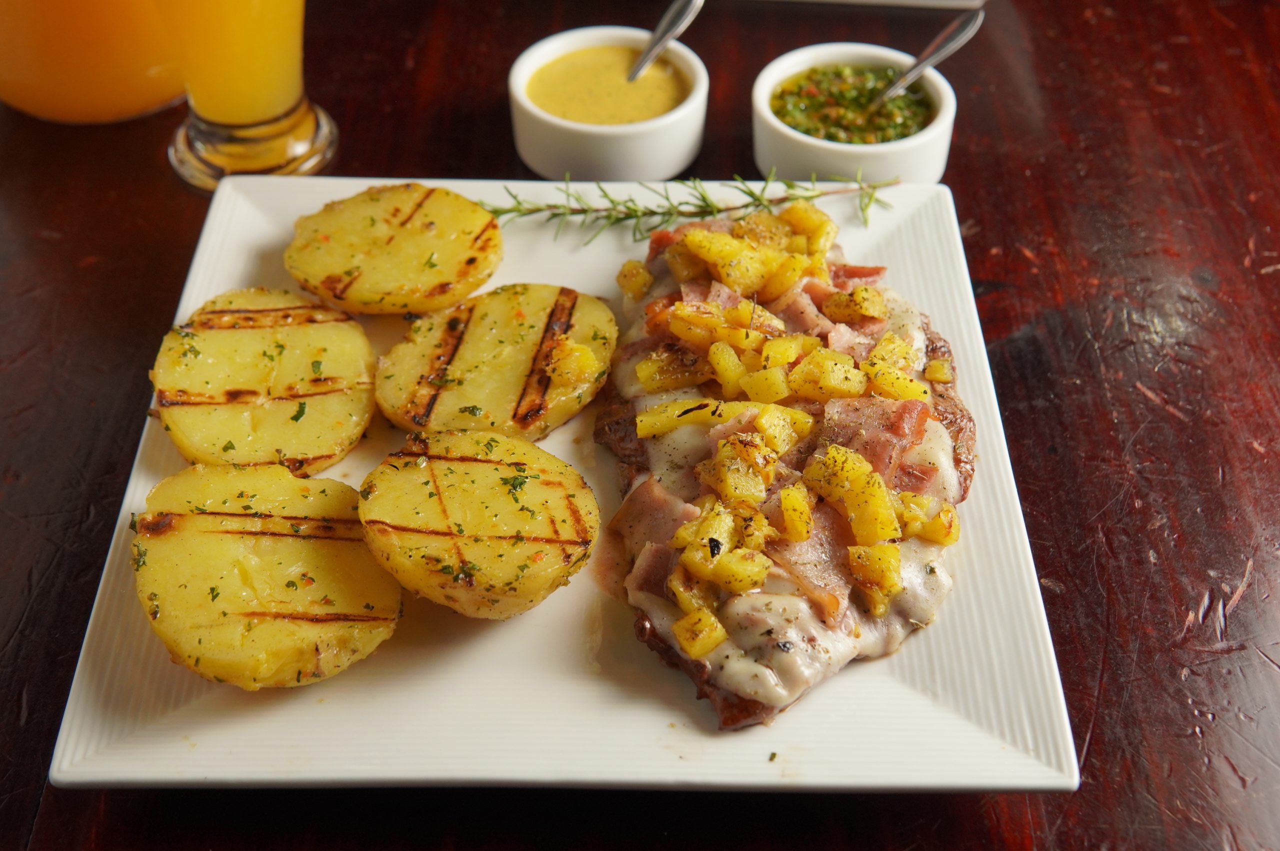 Lomo Fino + Queso Mozarella + Tocino + Piña + Salsa de la Casa + Papa Rustica + Ensalada