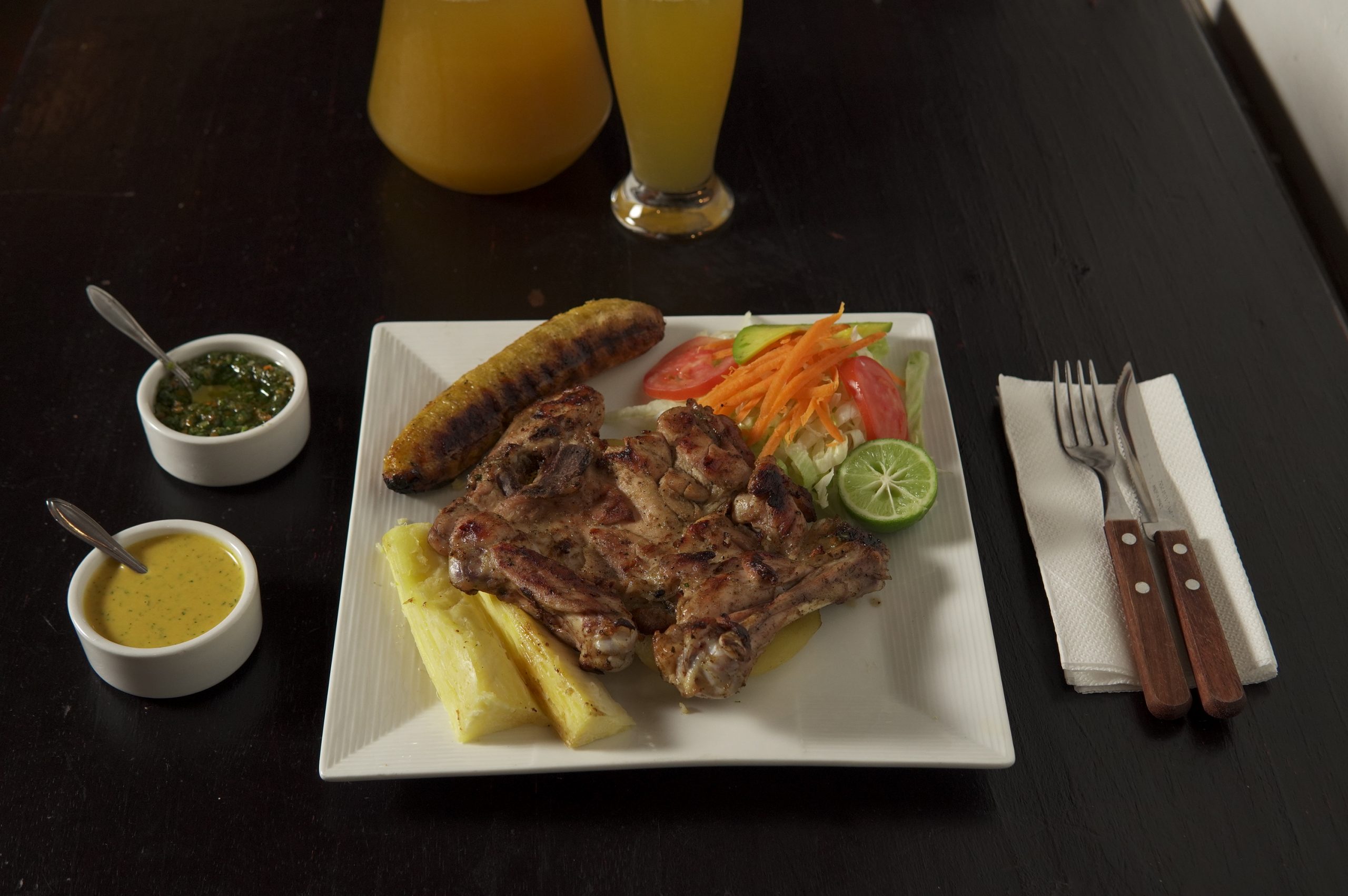 Pollo a la Parrilla (Pierna) + Plátano Asado + Yuca / Papa + Ensalada