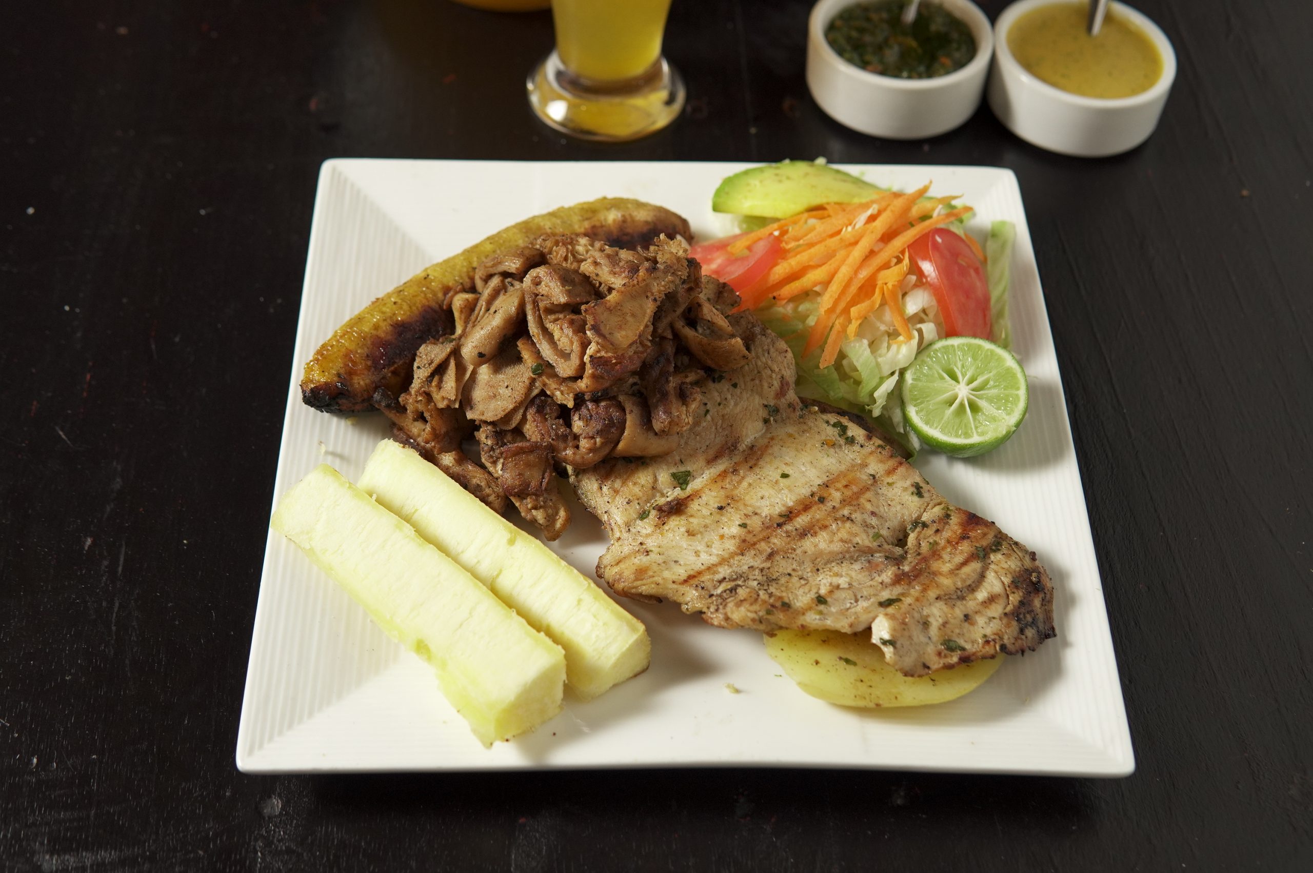 Pechuga a la Parrilla + Rachi + Papa / Yuca + Plátano Asado + Ensalada