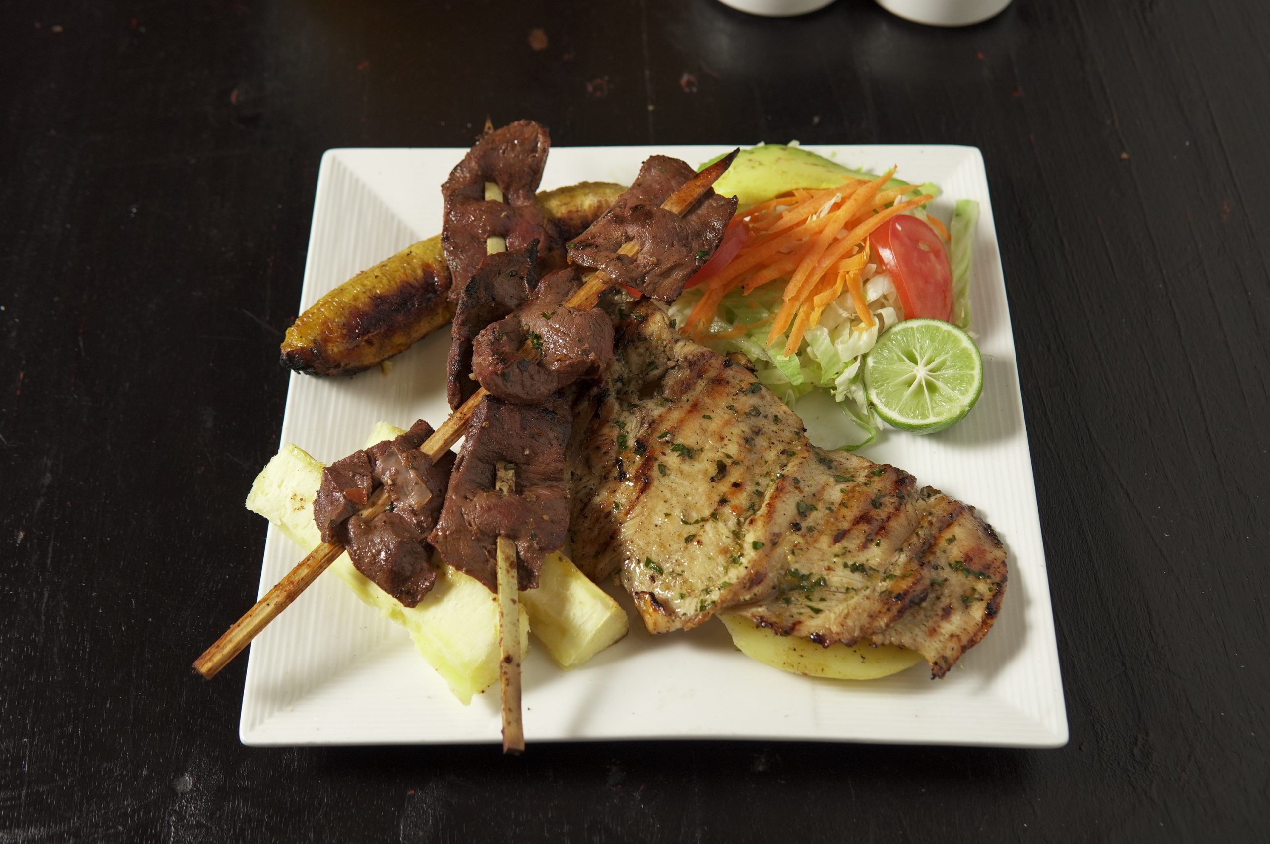 Pechuga a la Parrilla + 2 Palitos de Anticuchos + Papa / Yuca + Plátano Asado + Ensalada