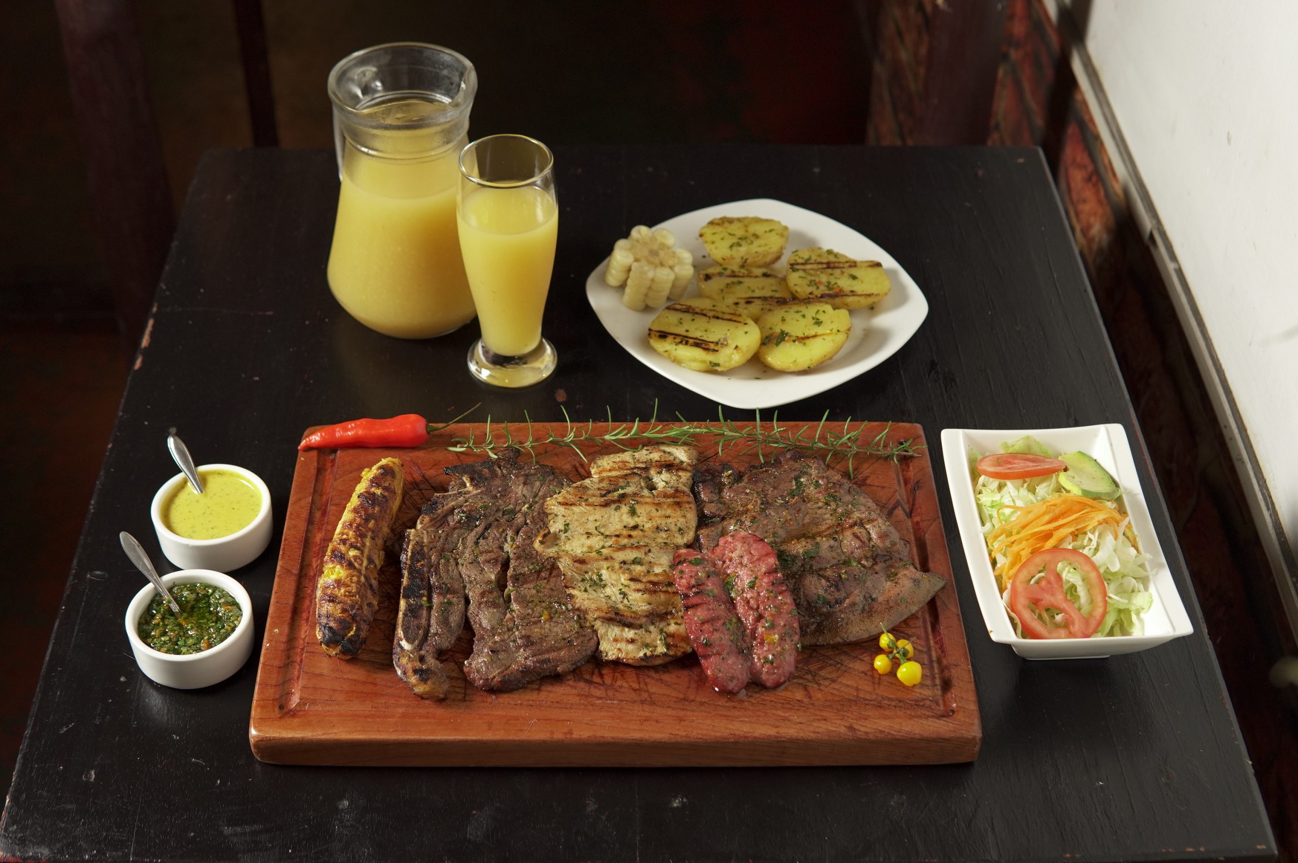 800 gr de Carne Exquisita para los Paladares Selecto + Papa Rustica + Choclo + Plátano Asado + Ensalada Parrillera